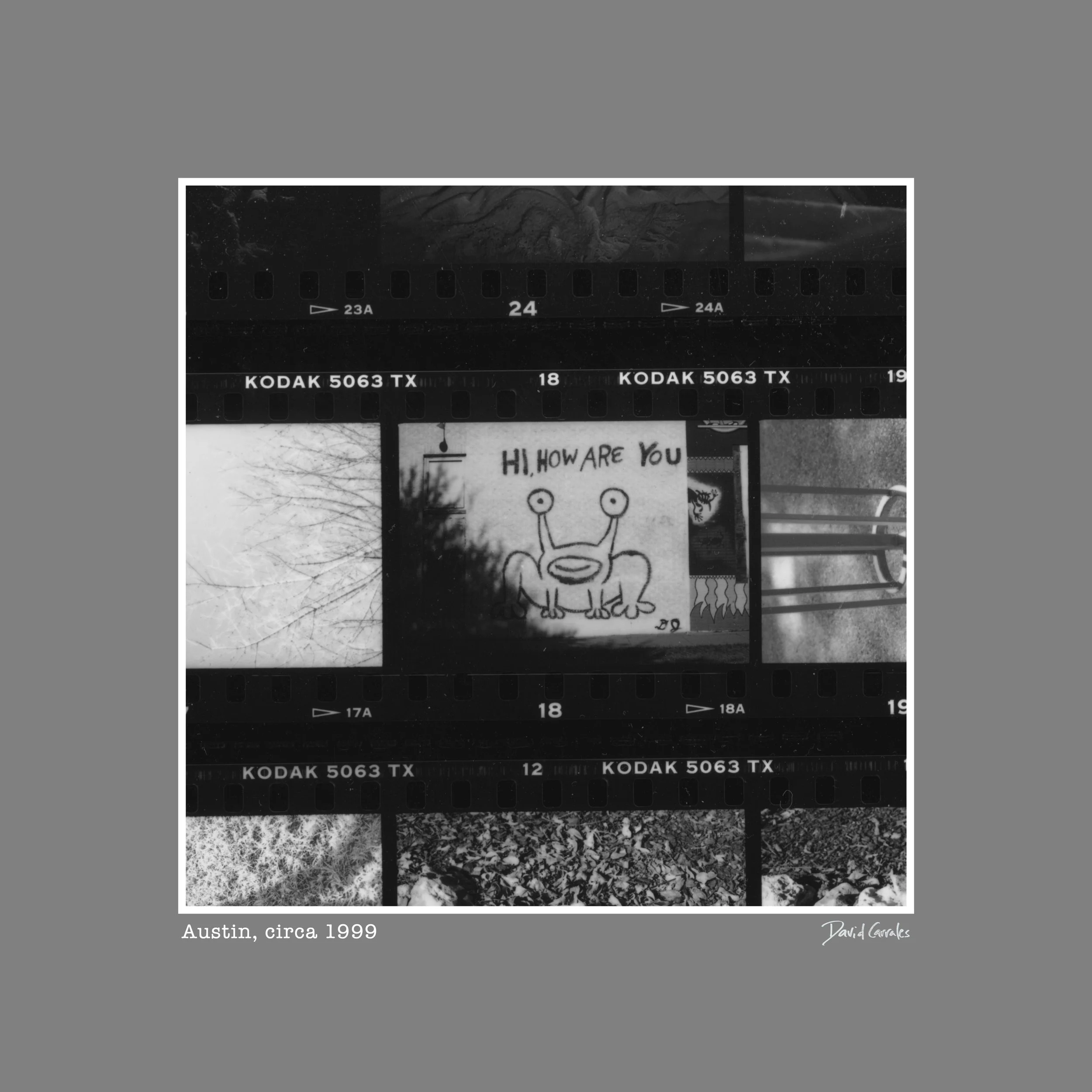 Daniel Johnston's Jeremiah the Innocent (aka The Hi How Are You? Frog) has been a fixture on the wall at the corner of Guadalupe and 21st Street. It's still there as of now (January 2026), the lone wall standing in the midst of urban renewal across the forty acres. I took this photograph of Jeremiah the Innocent back in 1999 using a film camera (my trusty Canon T70 SLR), and decided to scan and then enlarge the contact sheet.